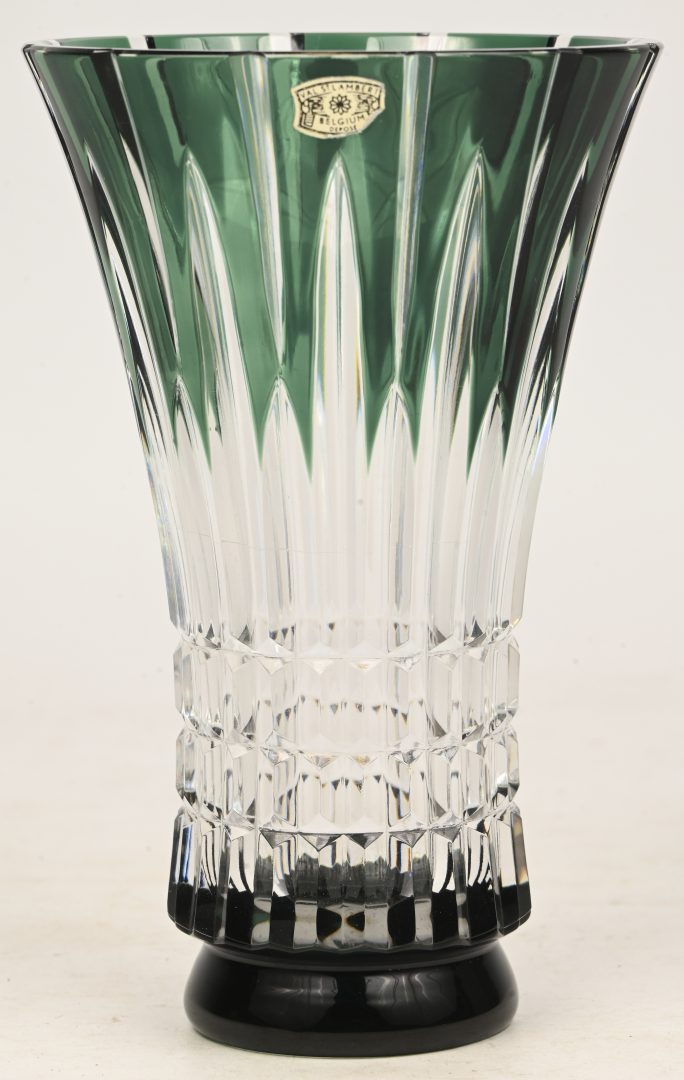 #302Val Saint LambertEen geslepen kristallen vaas, groen in de massa gekleurd, met sticker gemerkt.