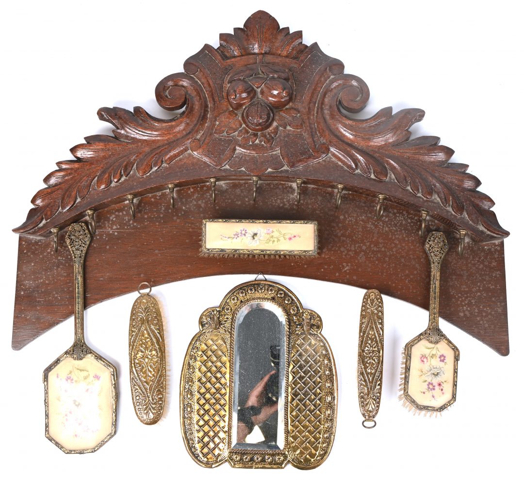 Een gevarieerd koperen lot bestaande uit een spiegeltje met 2 borstels en een handspiegel eveneens met 2 borstels.