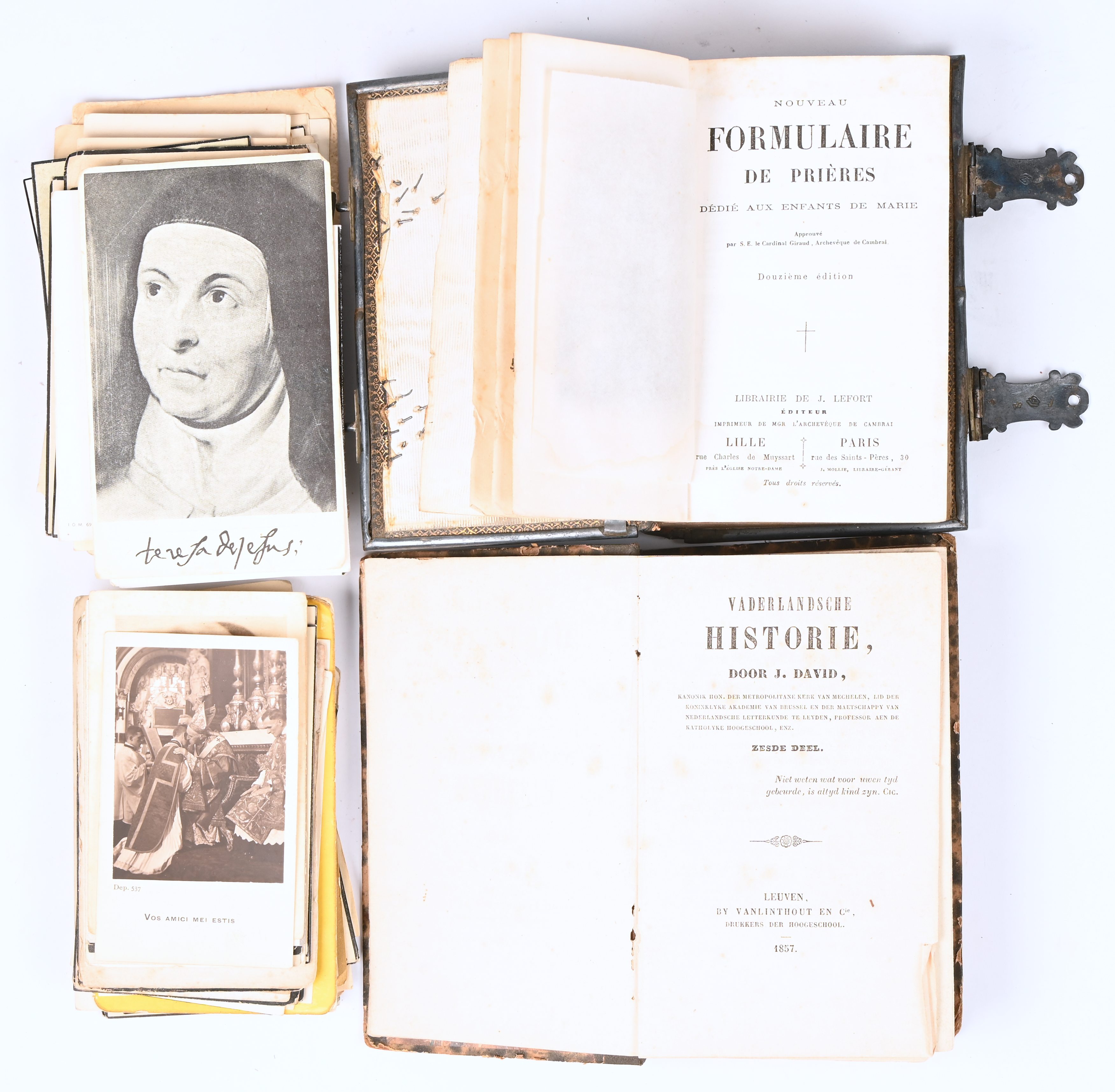 A varied lot consisting of 2 books: Nouveau Formulaire de Prières, 1848, with silver-plated metal closure, vaderlandsche historie, sixth part, history of Henegau, 1857 and a lot of 19th and 20th-century memorial cards.