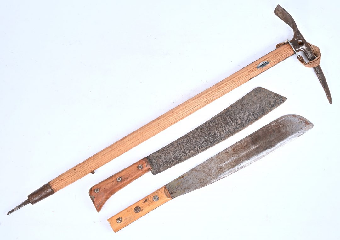 A varied lot consisting of 2 old machetes and a vintage ice axe.