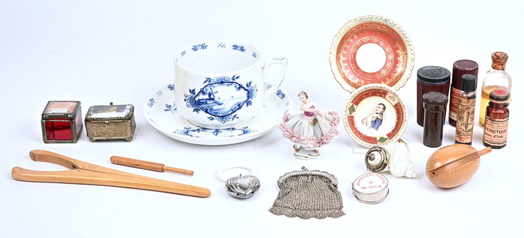 Een gevarieerd lot bestaande uit flesjes, een tas, naaigerei, kistjes, een rammelaar, een luciferhouder, een beeldje, ...