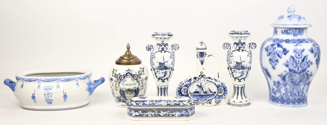 Een lot van drie vazen en drie kannen in Delfts blauw aardewerk.