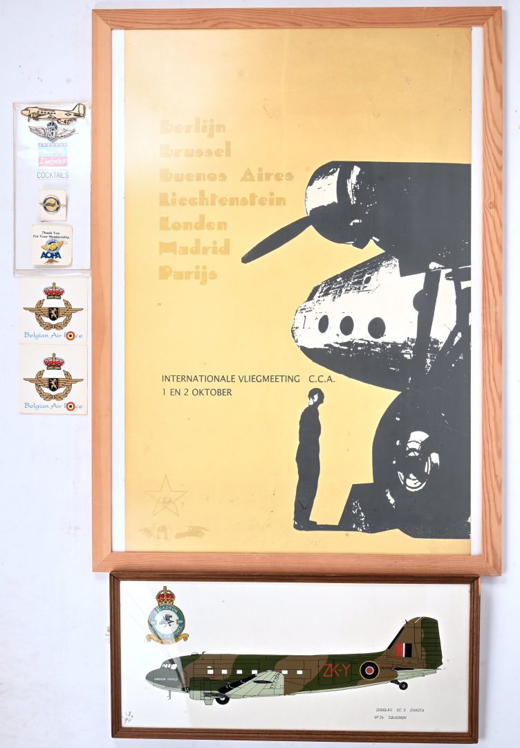 Een gevarieerd lot luchtvaart memorabilia bestaande uit een eglomisé, DC3 door Steve Foster, een poster van een vliegmeeting, een doosje met cocktail menu, 2 stickers, een c-47 uit rubber e, 4 badges/pins waaronder een KLM piloten badge.