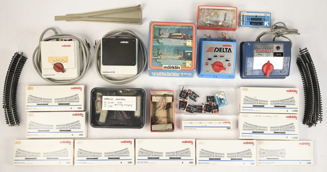 #153MärklinEen lot Märklin treinen en toebehoren bestaande uit 2 starterssets, enkele doosjes sporen, een transfo, een tunnelberg en enkele gebouwen.