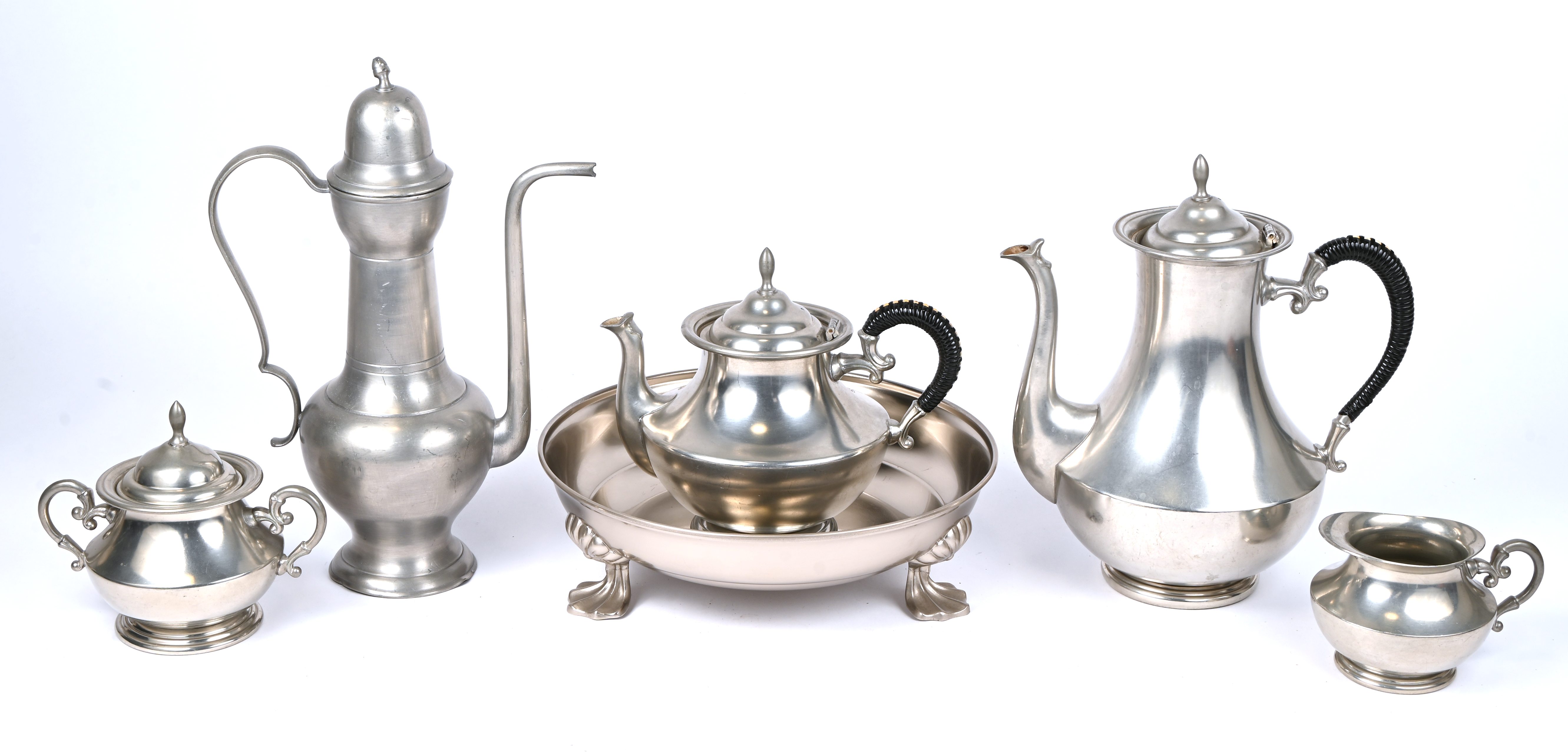 A varied lot of pewter, 4025 grams, consisting of a coffee and tea set, a bowl, and a jug.