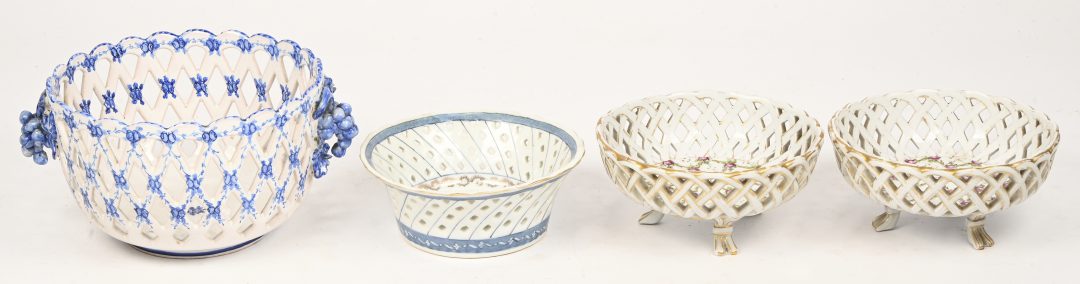 An openwork porcelain lidded pot decorated with flowers, in the style of Capo Di Monte. Damaged. -