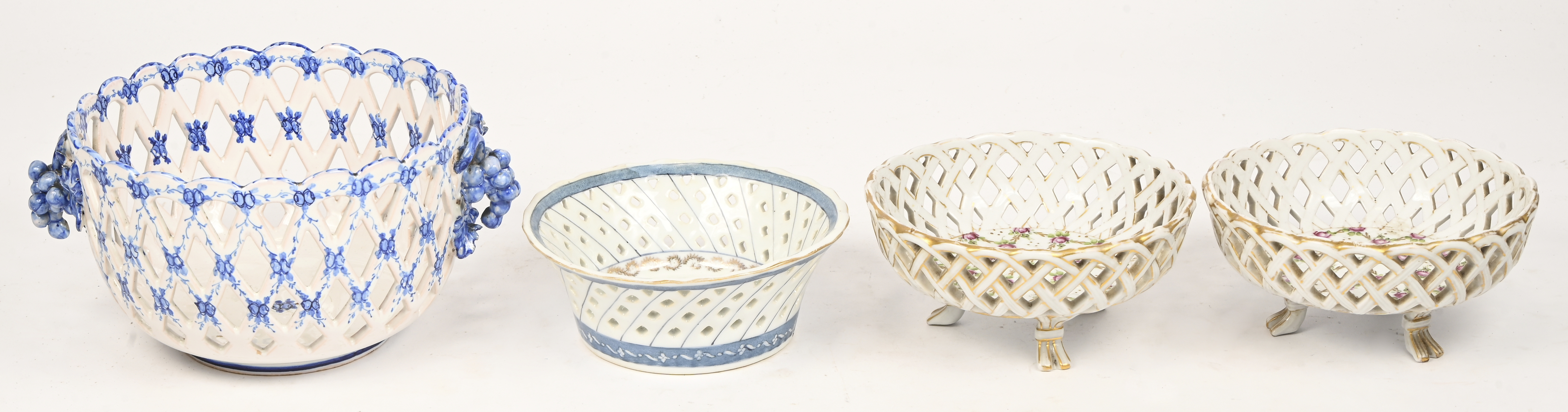Een opengewerkt porseleinen dekselpotje versierd met bloemen, in de stijl van Capo Di Monte. Met schade.