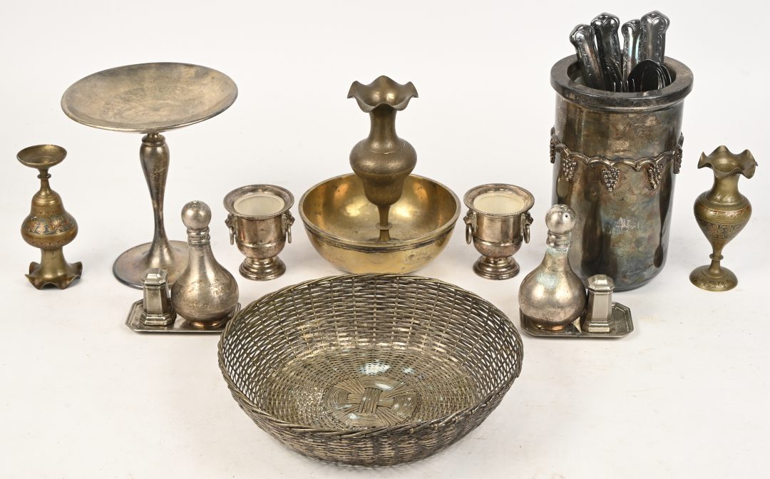 #117Een lot van vier antieke metalen voorwerpen, waaronder een kunstig bewerkte karaf, een sierlijke dekselpot, een verzilverde vaas en een gedetailleerd beeld van een haan.