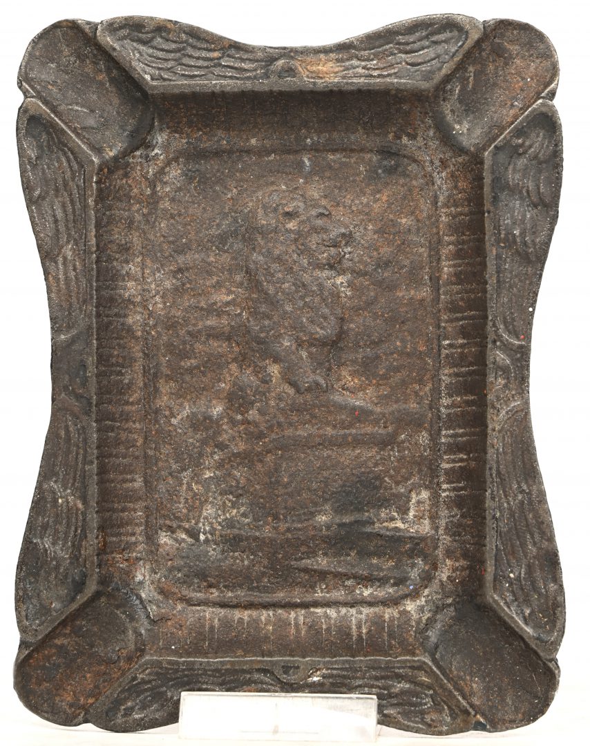 A cast iron ashtray with the image of the Lion of Waterloo.