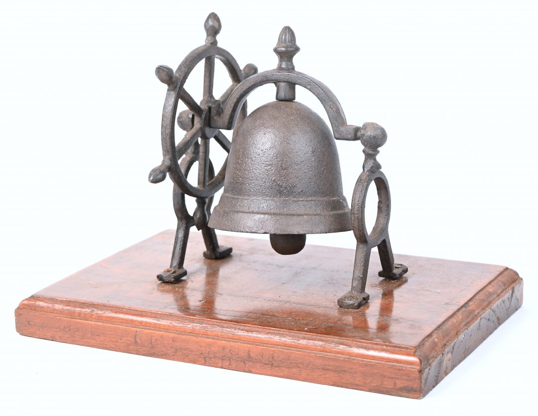 Een gietijzeren belletje op voet.