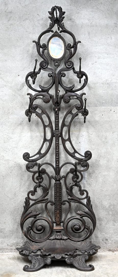 Een gietijzeren kapstokmeubel met spiegeltje in Louis XV stijl.