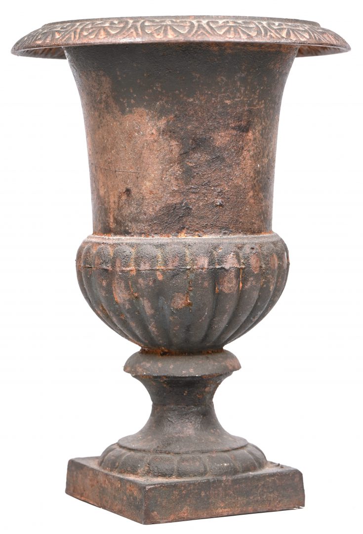 A cast iron garden urn.
