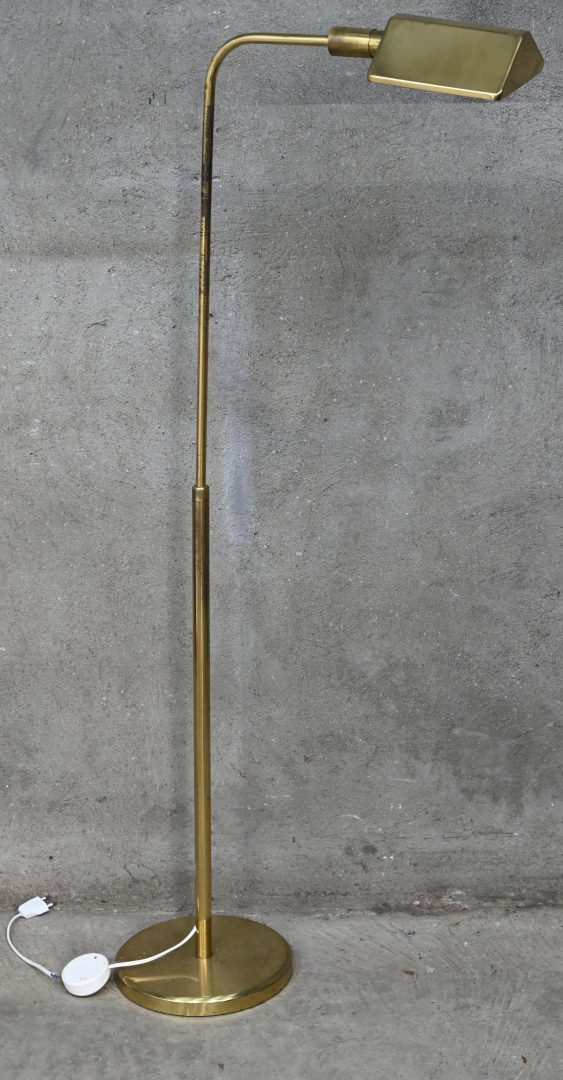 #130Een modernistische tafellamp, 3 verstelbare armen en groen gevlekte glazen kapjes.