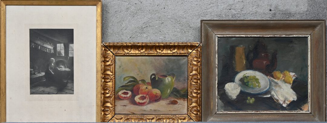 Een gravure met een moeder bij een wieg, Evenals twee kleine fruitstillevens op doek en op board. Niet gesigneerd.