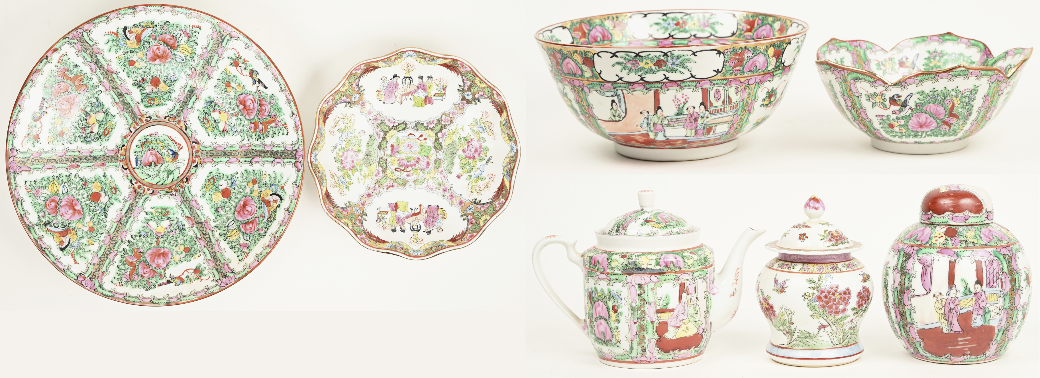#13Twee kraagvazen en een sierbord van meerkleurig Chinees porselein. Famille rose.