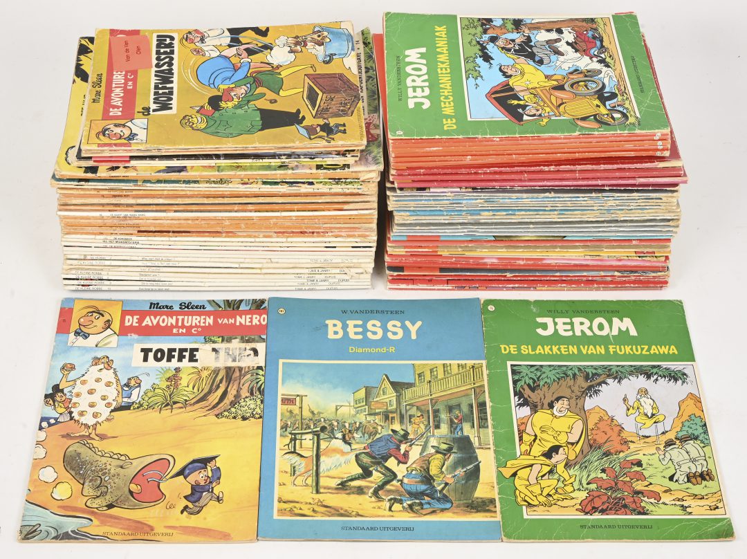 A lot of approximately 100 comics in well-read condition. Suske & Wiske, The Bluecoats, Tintin, Nero, and many others. -