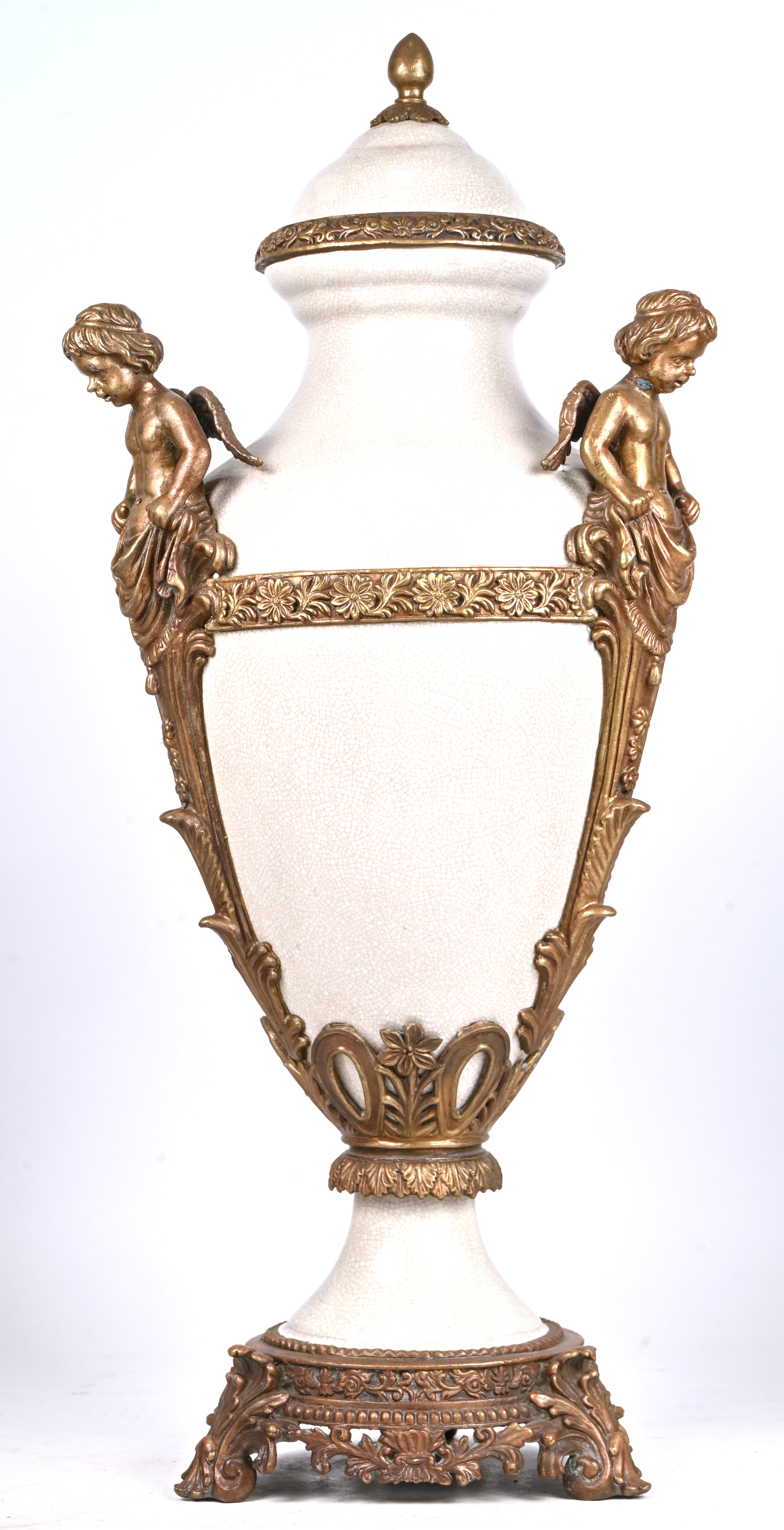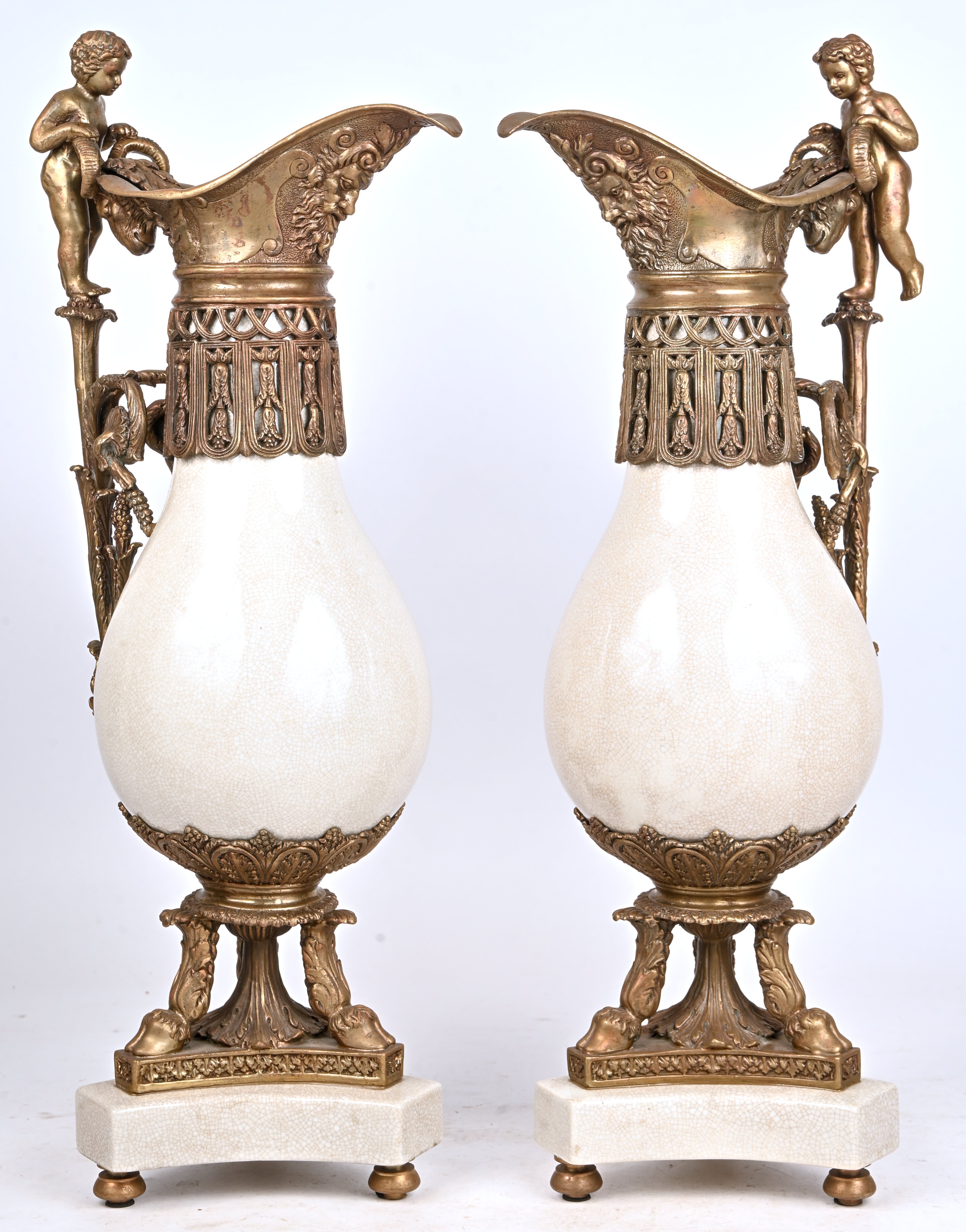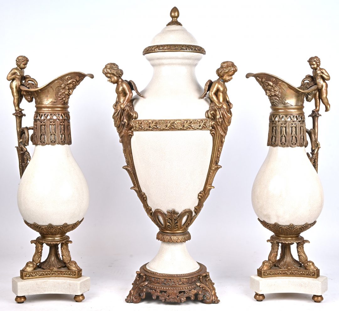 Een groot kaststel van aardewerk met grijswit craquelé glazuur en met verguld bronzen monturen versierd met engeltjes en putti. Bestaande uit een dekselvaas en twee sierkruiken. Kruiken onderaan gemerkt.