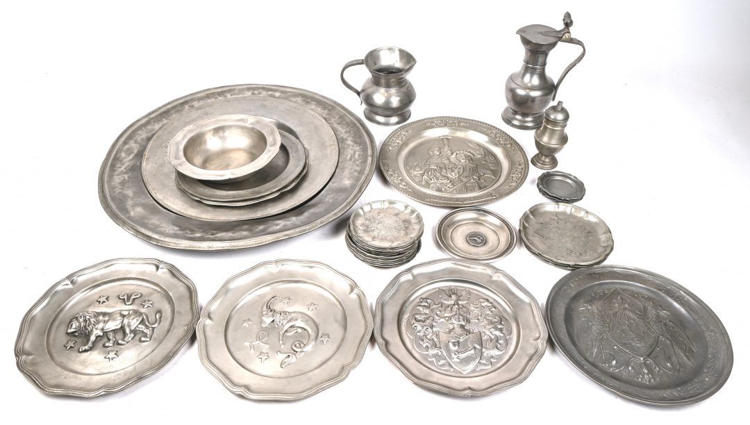 A lot consisting of: a pair of candle holders carried by angels, a menorah, a small ship lamp, a samovar, a bar bell, a fig bud, a plaque of Antwerp, an oil lamp, a bottle opener with heraldic lion. As well as a pewter dish and a pocket knife.Place a bid ›Estimate: € 60 / 100 -