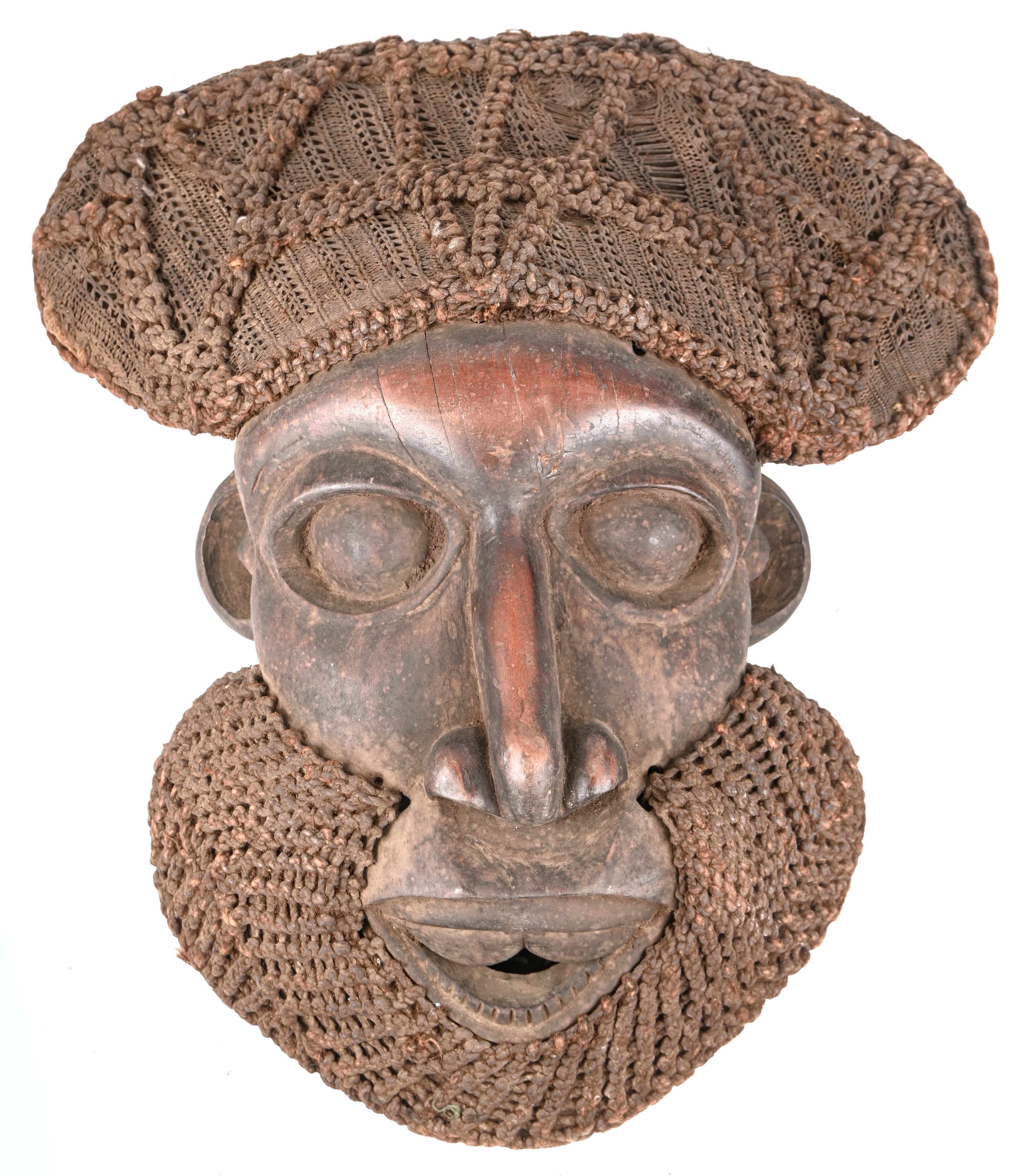A mask made of carved wood with a headpiece of rope. From Cameroon. -