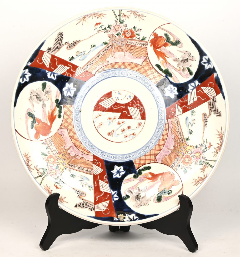 Vijf dessertborden van Imari porselein. Eén paar en een serie van drie gelijksoortig gedecoreerde. Begin XXste eeuw.