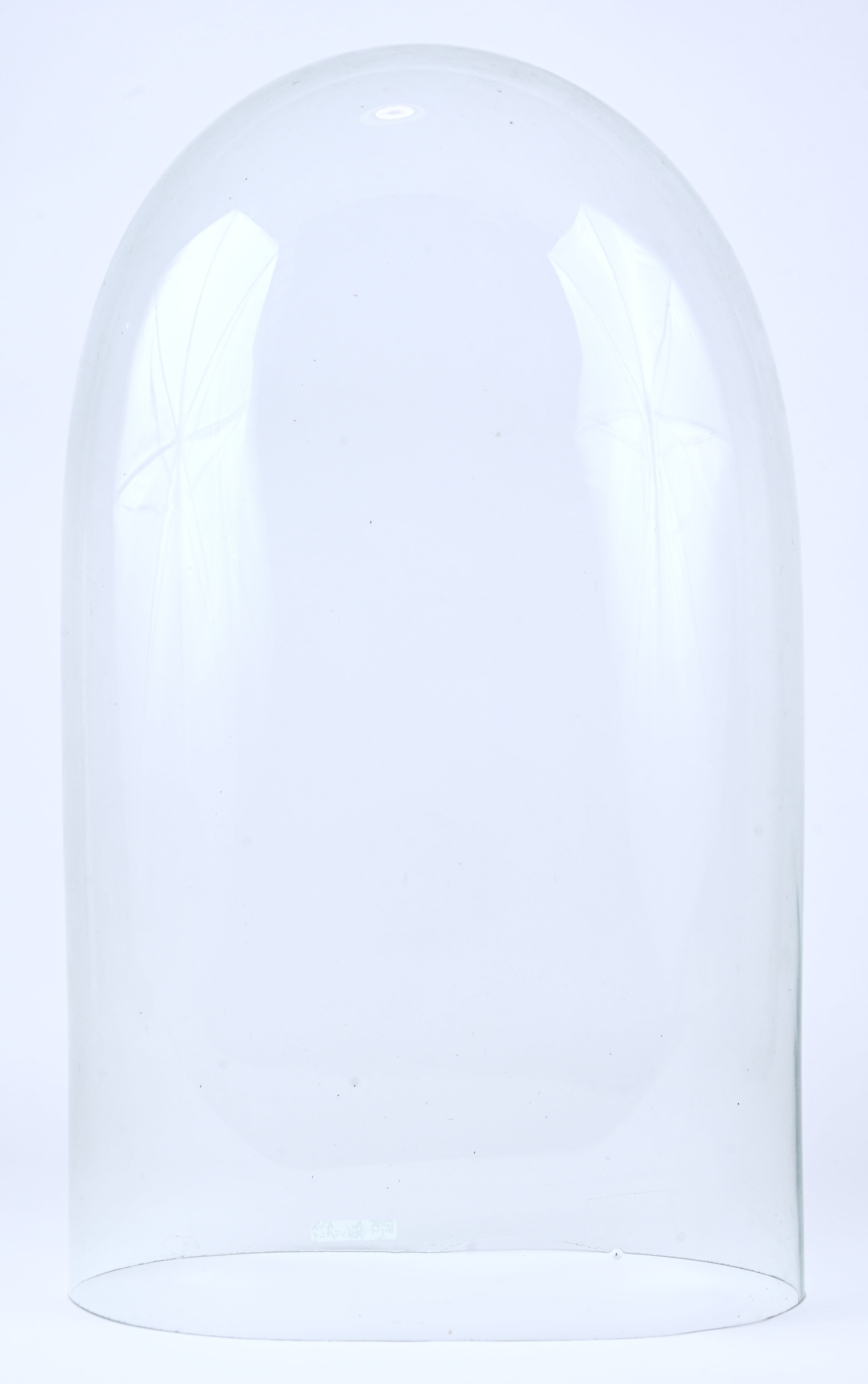 Een grote antieke glazen stolp, ovaal, zonder sokkel. Schilfer onderaan.