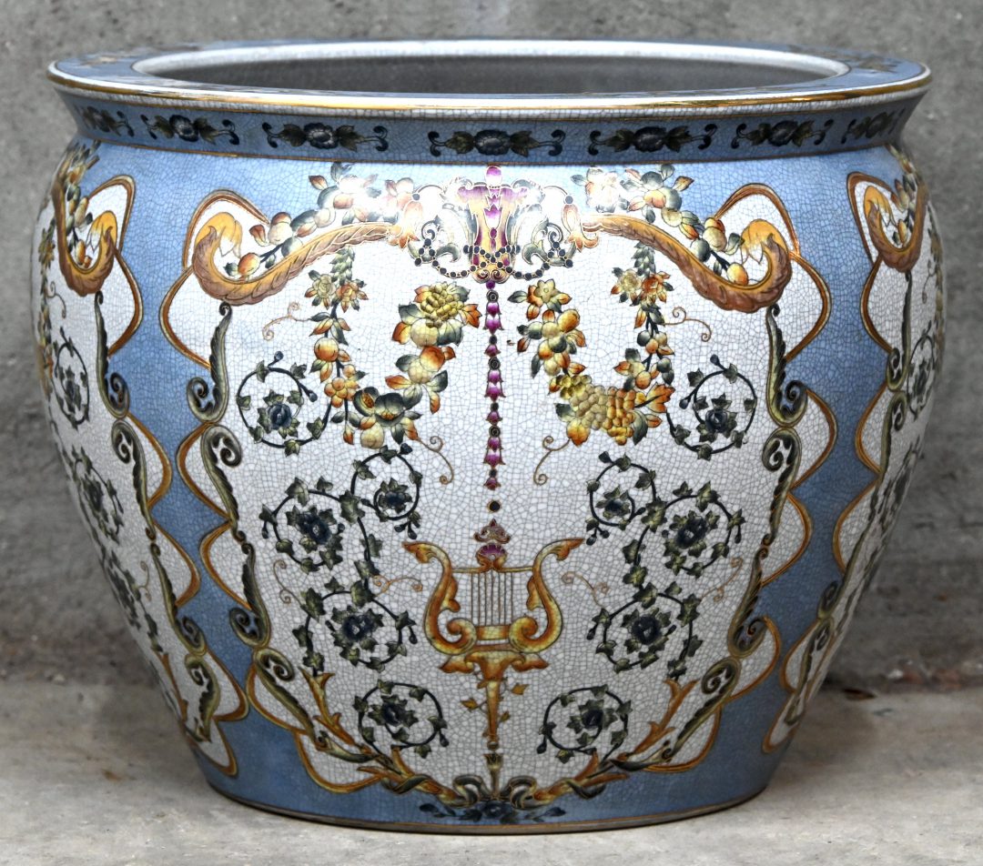 Een grote cache-pot, rijkelijk gedecoreerd met harpen en bloemenguirlandes. Gemerkt Dominic.