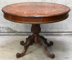 #106Een gemarquetteerde ronde tafel in Victoriaanse stijl op centrale voet.