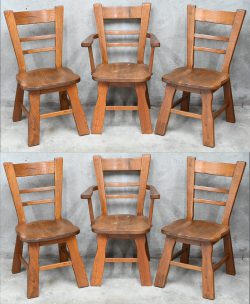 #203Een set van 6 massief eikenhouten stoelen, 2 met armleuningen, in brutalistische stijl.