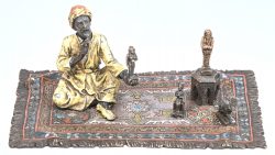 #131Een bronzen Arabische handelaar op een tapijt gezeten.