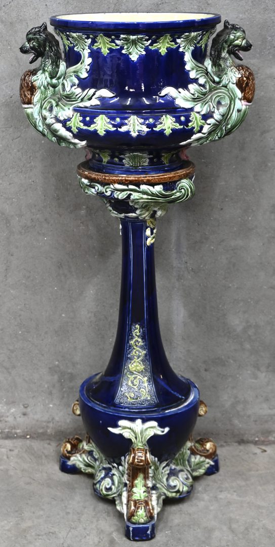 Een grote geglazuurd aardewerken jardinière, met draken geflankeerd, restauratie aan de voet.