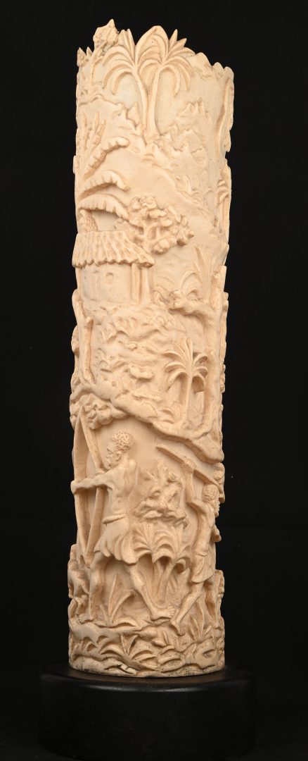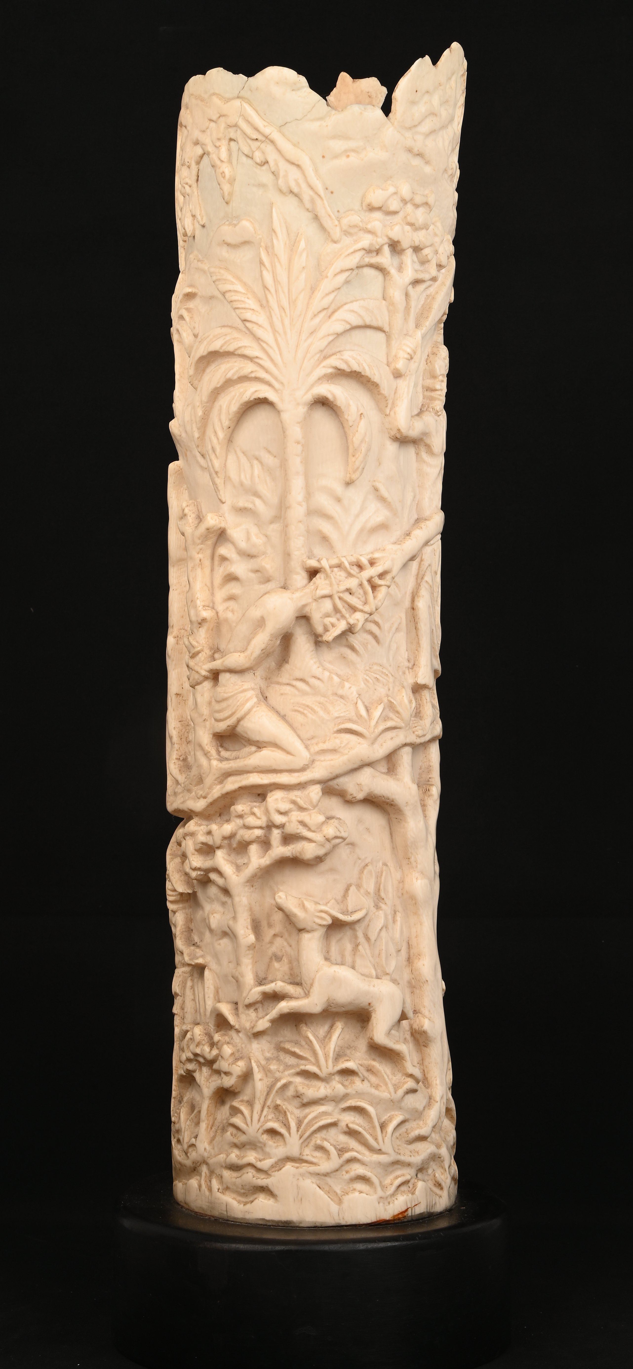 A large ivory vase decorated with characters and vegetation in relief, sculpted from a large piece of tusk. Congolese work. With CITES certificate.