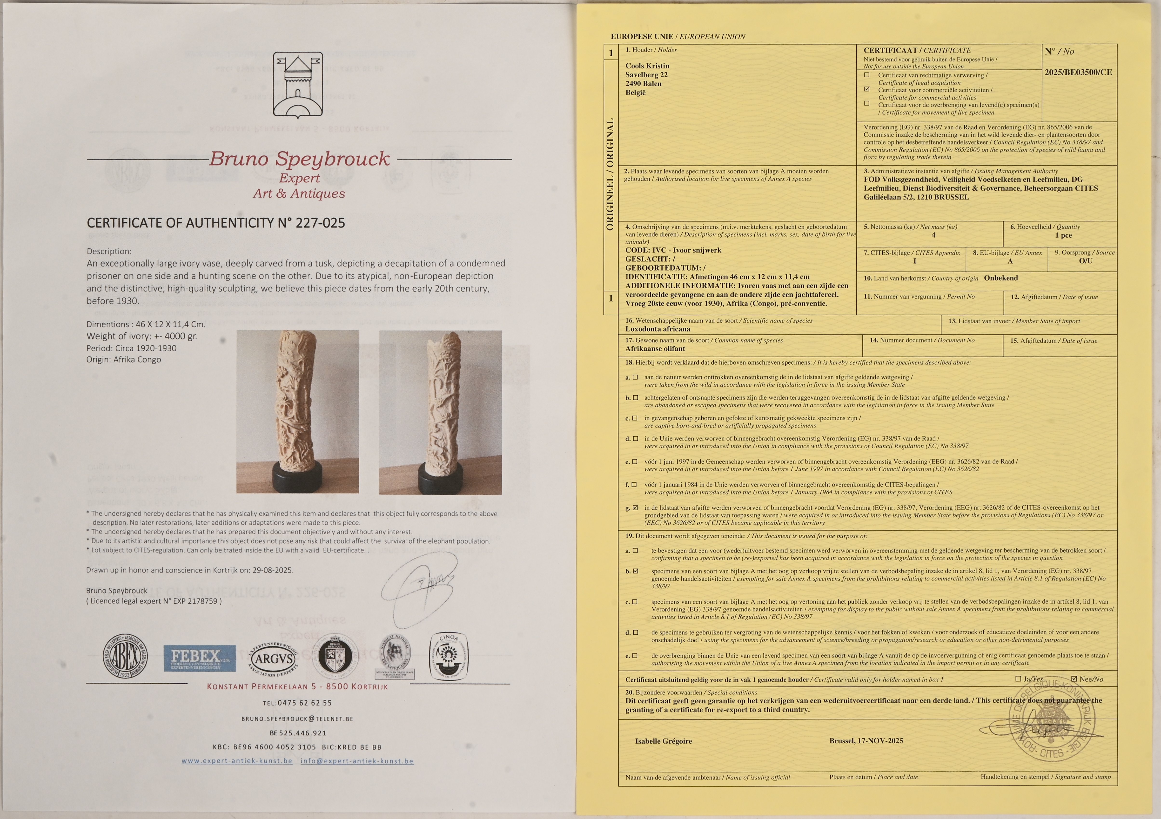 Een grote ivoren vaas versierd met personages en vegetatie in reliëf, gesculpteerd uit een groot stuk slagtand. Congolees werk. Met Citesattest.