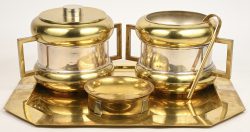 #111Een vintage Italiaanse sommelier set, messing en zilver, uitgebracht circa 1970 voor het Associazione Italiana Sommelier, (gemerkt ais), bestaande uit een dienblad, een ijsemmer, een flessenkoeler (of kwispedoor) en een kaviaar schaaltje. Zilvermerken: 925, alsook 800, MI (Via Delle Asole 4 - Milano) Toegevoegd een ijstang.