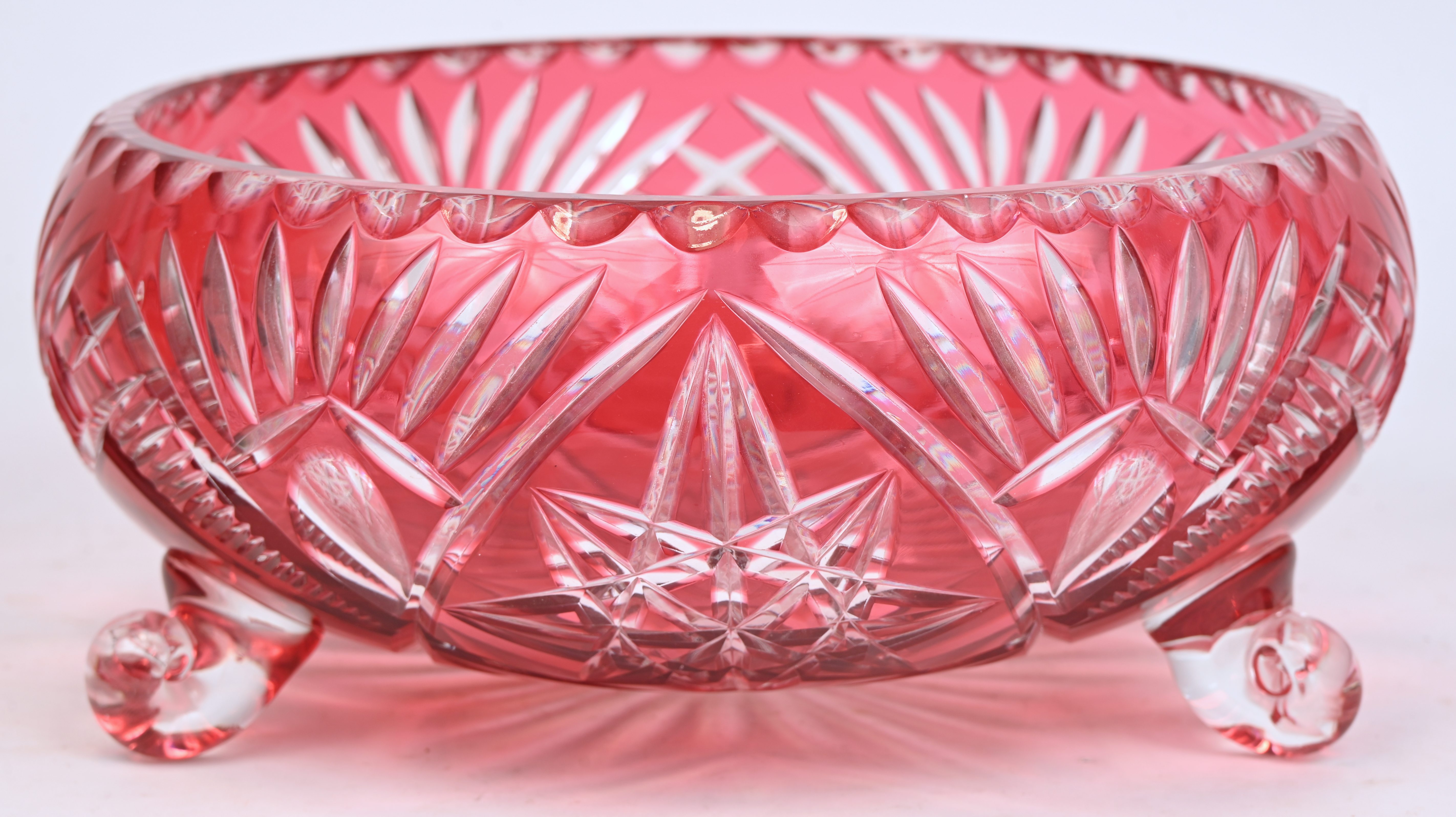 Een grote kristallen coupe op 3 voetjes, rood in de massa gekleurd.