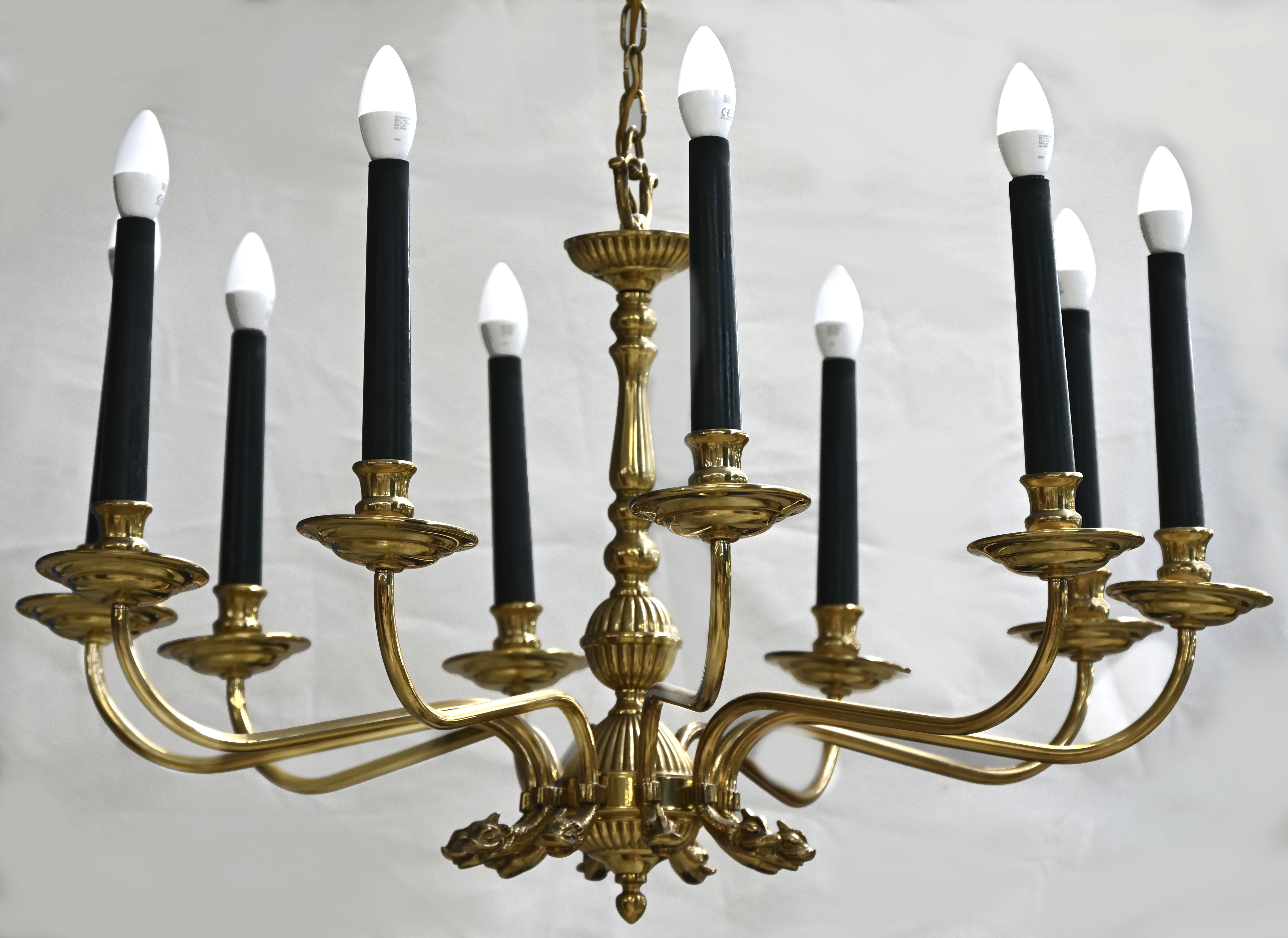 Een grote messingen luchter in Empire-stijl, 10 lichtpunten.