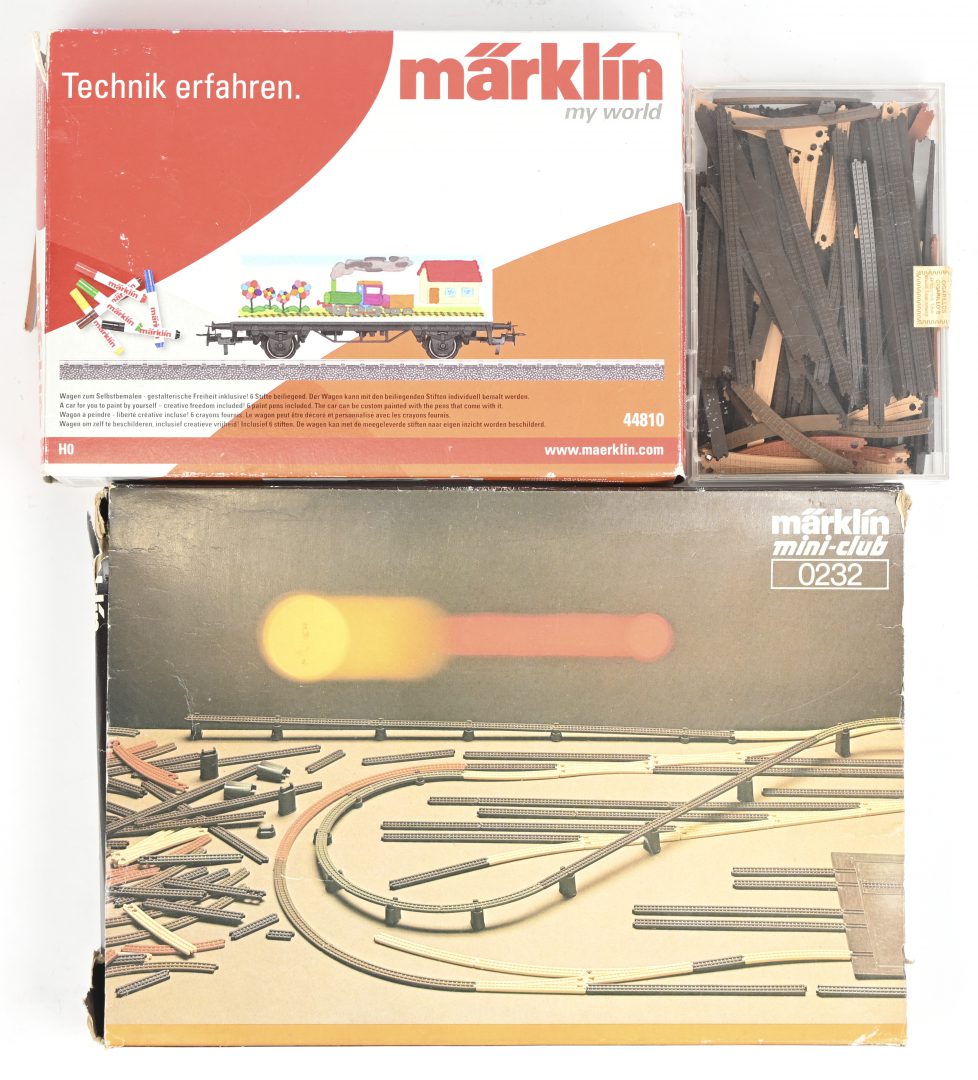 Een grote partij Märklin mini-klub sporen, kunststof. Toegevoegd een wagon, 44810, ‘Blanco containerwager. Compleet met stiften in OVP.