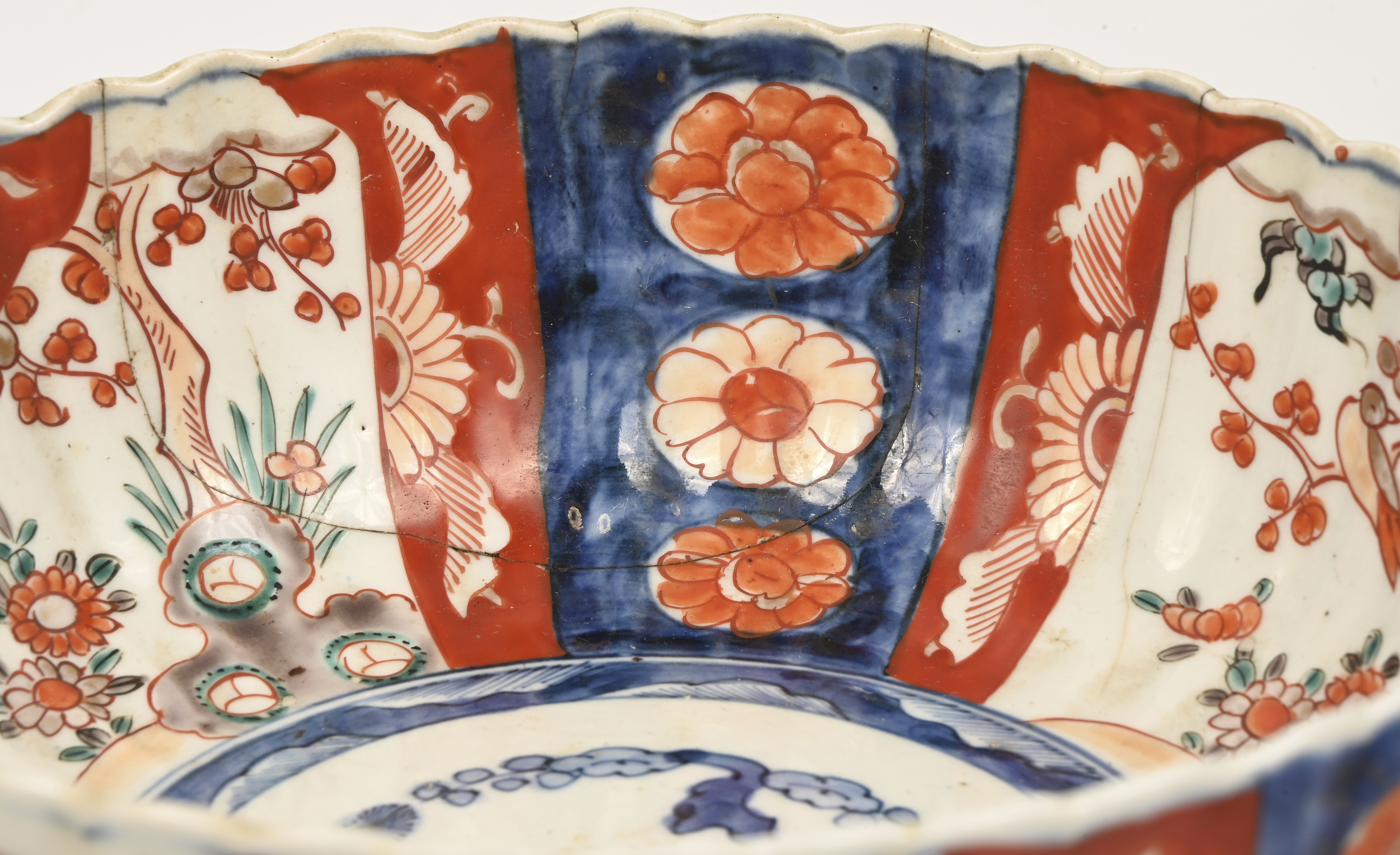 A decorative dish and three bowls of multi-colored Chinese porcelain, famille rose. Stamped. -