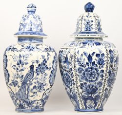 A lot of 2 Delft blue earthenware covered vases. -