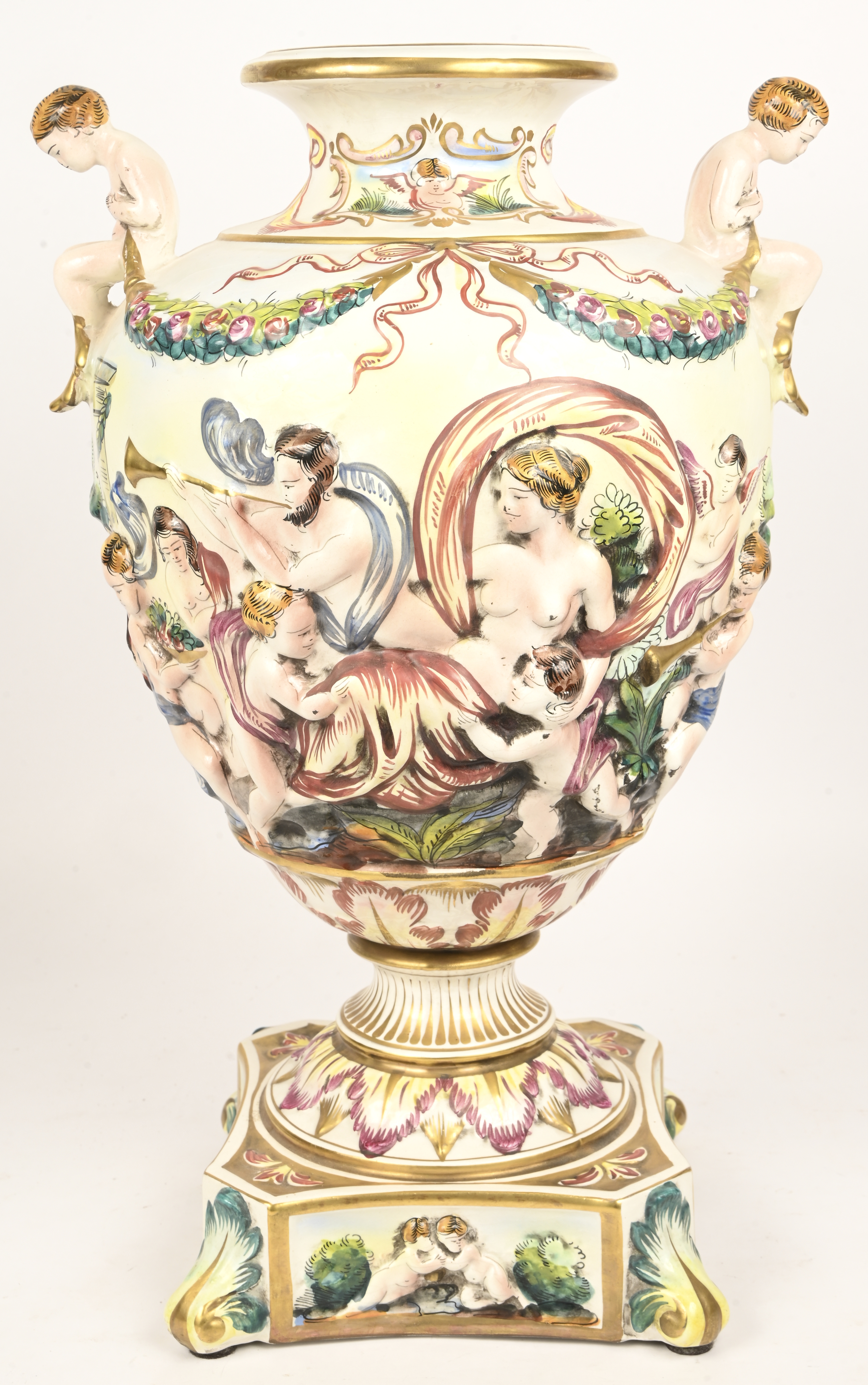 A blue porcelain, vintage Italian table lamp with a glass shade. Decorated with plant motifs and marked at the base.No longer availableDim. h 48 x Ø 44 cmEstimate: € 80 / 120 -