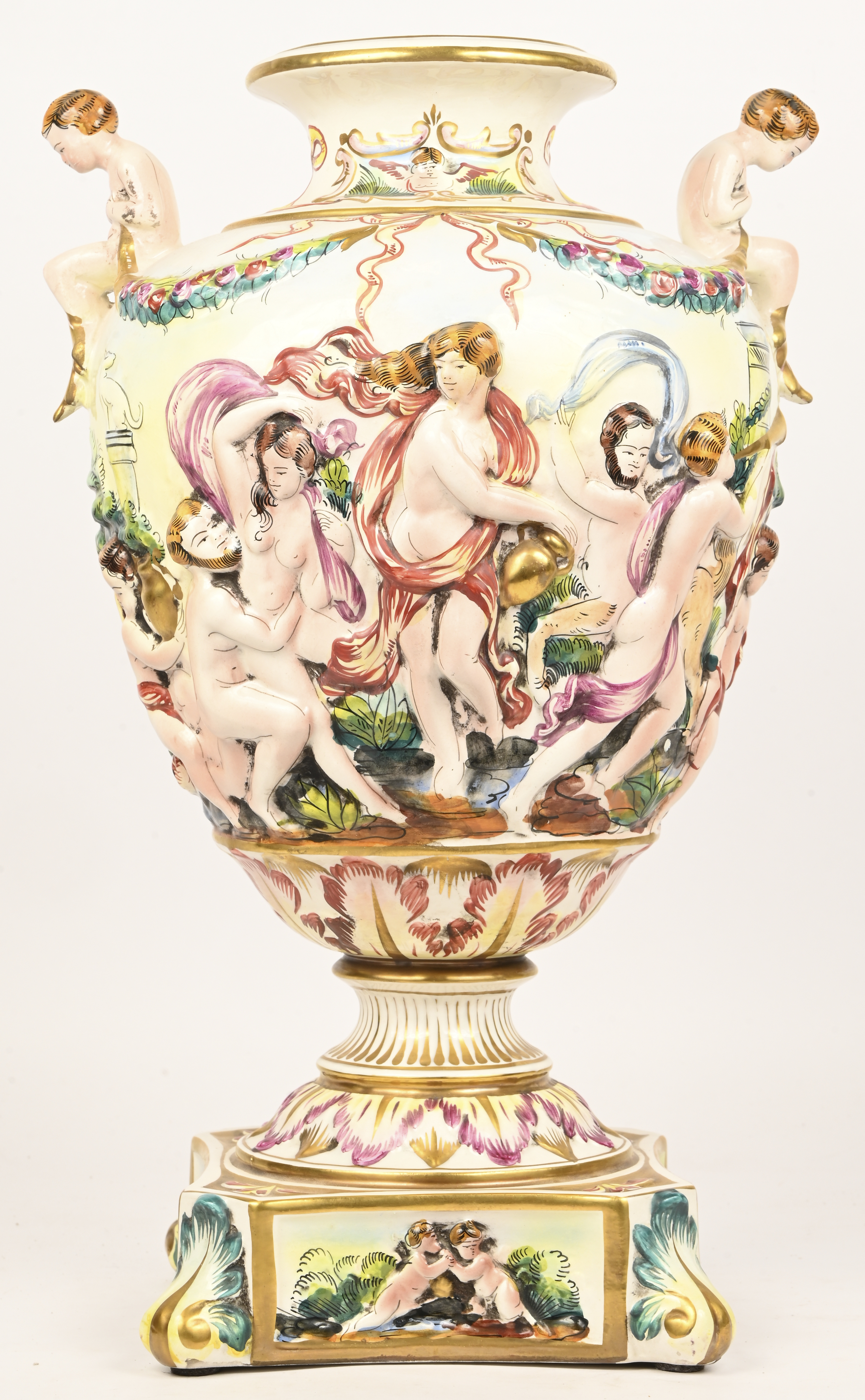 A pair of earthenware jugs with cobalt blue necks and a monochrome garland on the body. Marked at the bottom. Some chips on the spouts.No longer availableDim. H. 19.5 cmEstimate: € 40 / 50 -