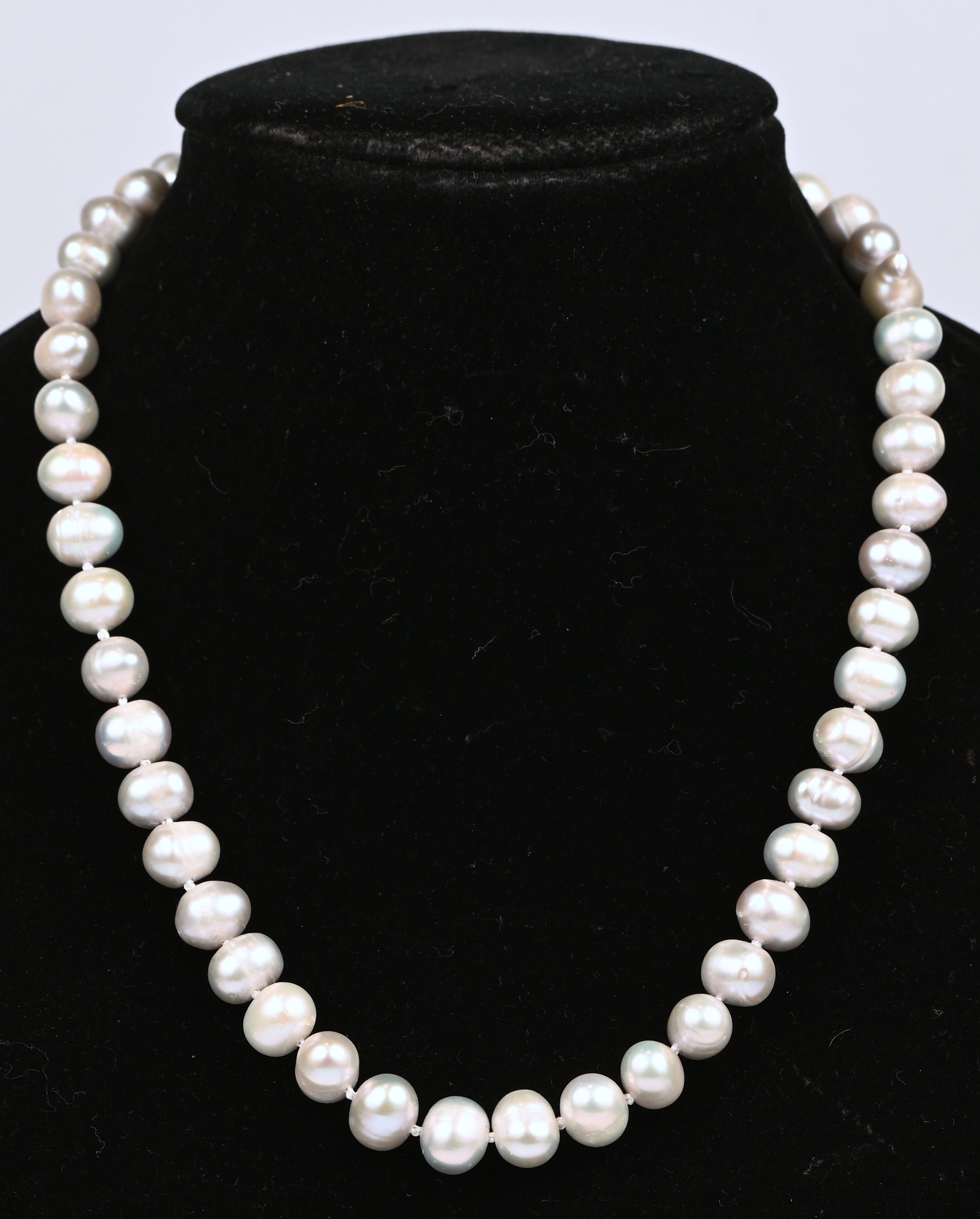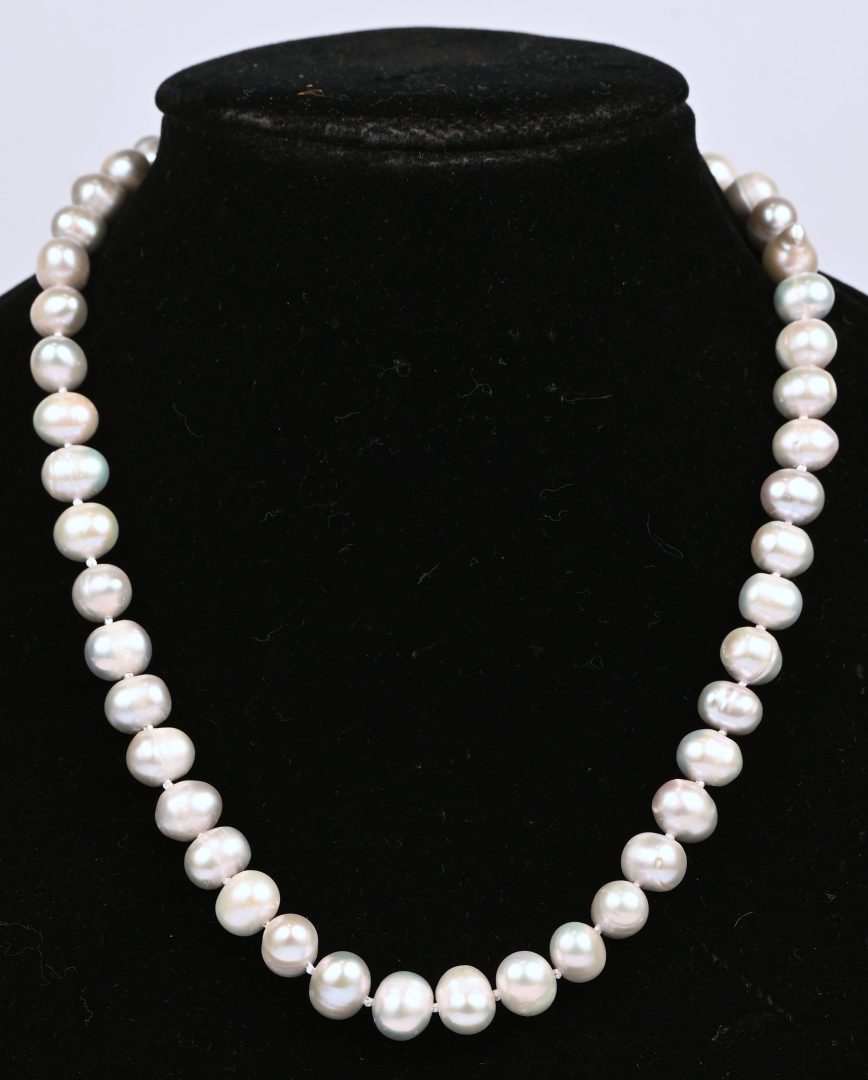 Een halssnoer met zoetwaterparels en met zilveren slot.