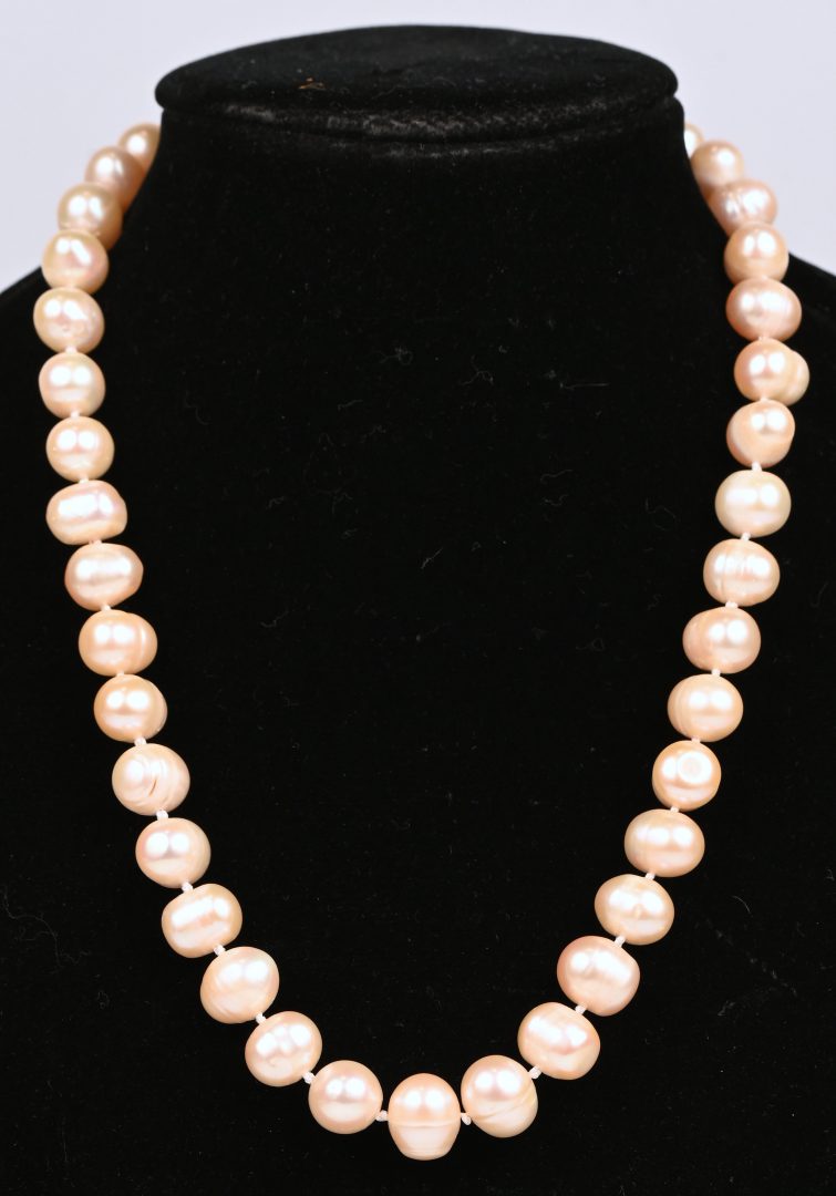 Een halssnoer met zoetwaterparels en met zilveren slot.