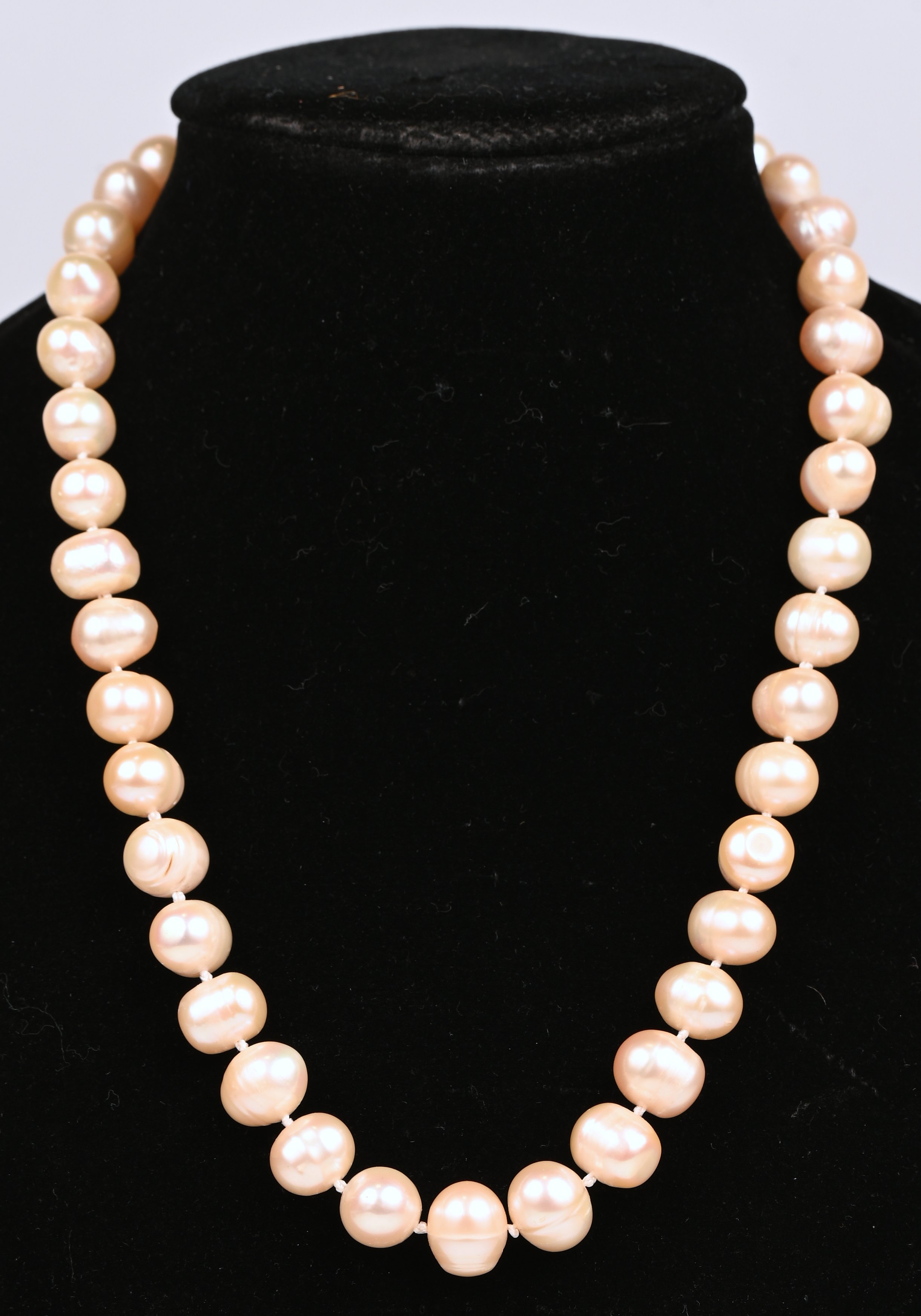 A necklace with freshwater pearls and a silver clasp.
