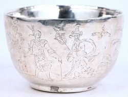 #215Een Chinese kom met zilver bekleed, met figuren gedecoreerd.AR17