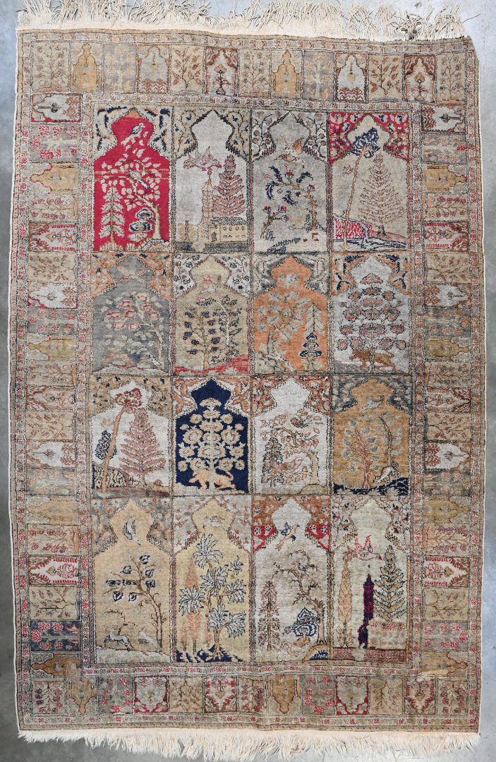 Een Iraans handgeknoopt zijden Ghoum tapijt.