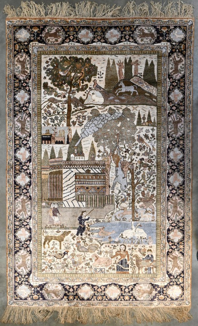 A hand-knotted silk Persian Ghoum carpet depicting a hunting scene. -