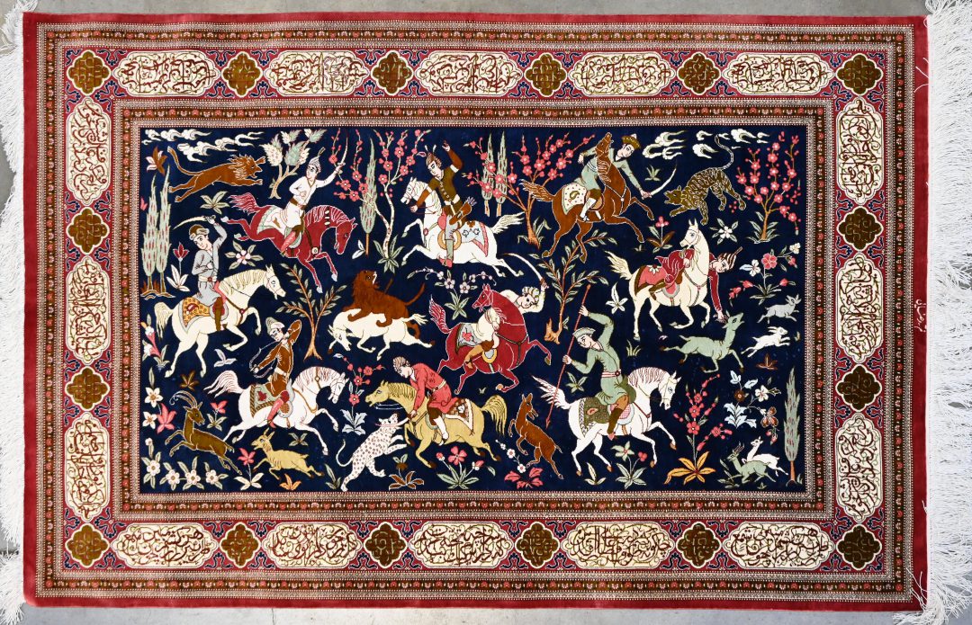 Een Iraans handgeknoopt zijden Ghoum tapijt.