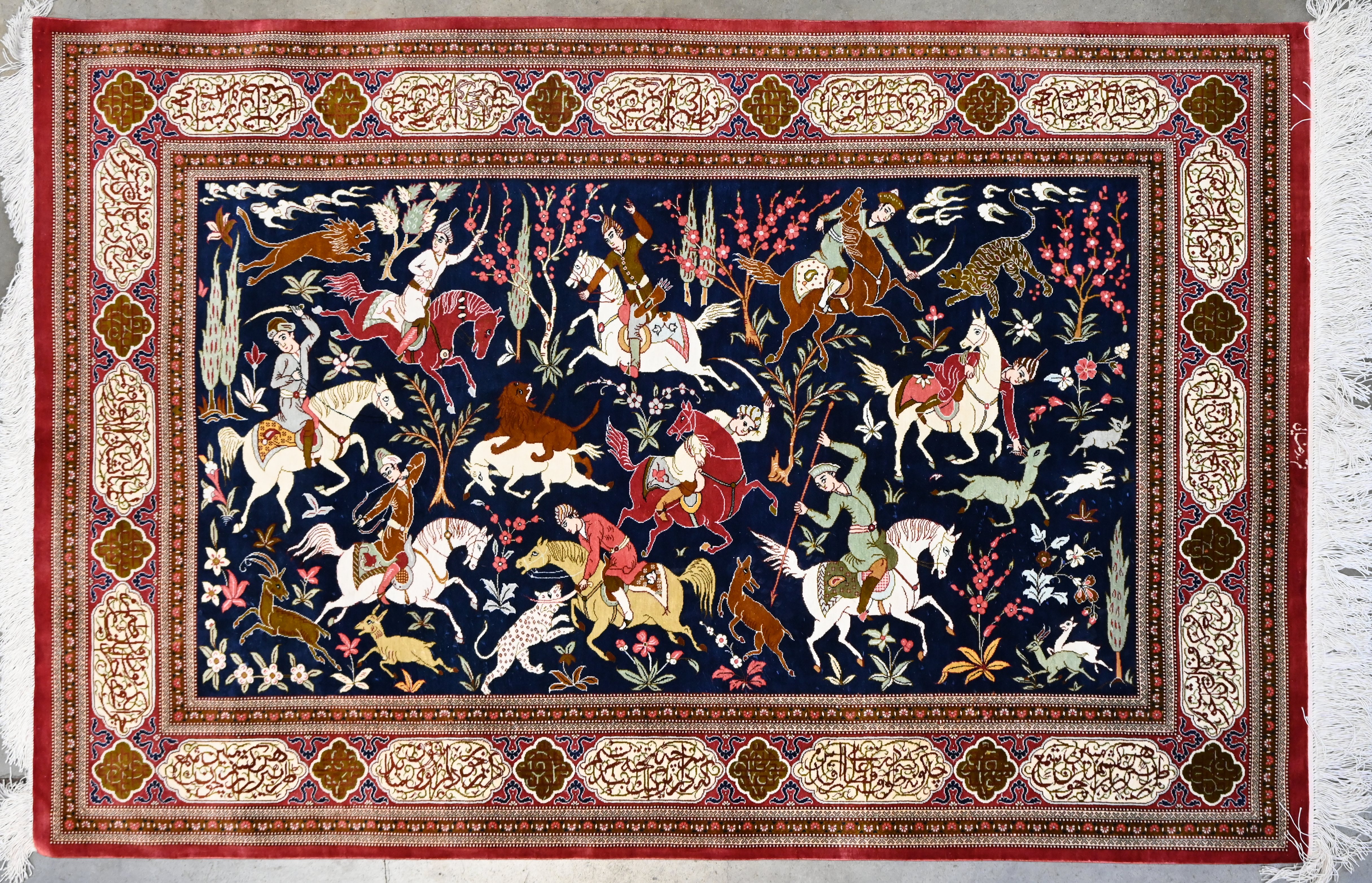 A hand-knotted oriental carpet with a design of hunters and exotic animals. -