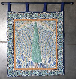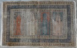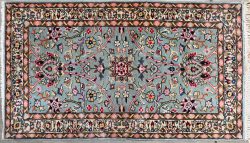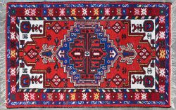 #287Een handgeknoopt wollen tapijtje, aan de rand versierd met kwasten en kralen.