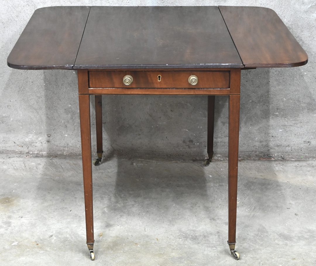 An antique side table with two drawers, a brass insert, and a wooden lid. Marquetry decoration. Some wear on the veneer. -
